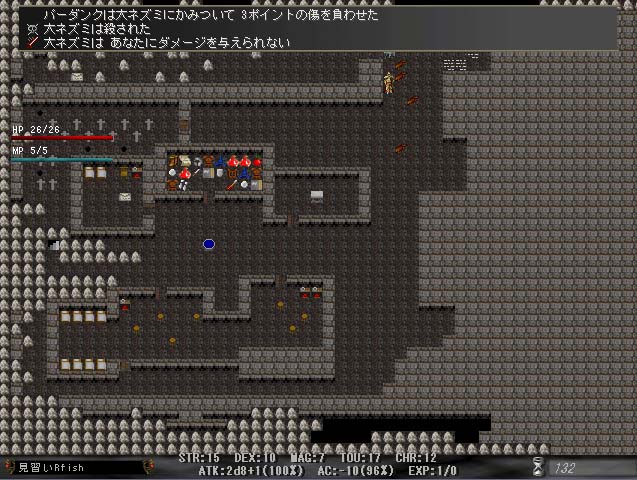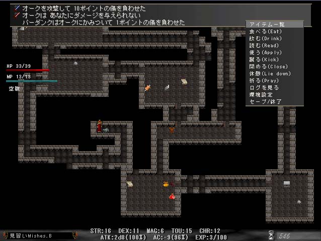 S H A D EShadeは、トルネコやシレンなどのゲームのモデルとなったローグライクというジャンルのゲームです。ランダムに作成されるダンジョンの中を、さまざまなアイテムを利用し、ひたすら下っていきます。作者のはじめての作品ですが、システムを煩雑に組み込んでしまったため、中途半端な部分がかなり残っています。HDDがクラッシュしたのを機に開発を停止してしまいました。HSPのおにたまさんのページに、まだ昔のファイルが残っていたので、それを再アップロードしました。exeからHSPのaxファイルを取り出せたのですが、asに変換できずソースがとれないため、改良できないままです。変換の仕方を知っている方がいたら教えてください。